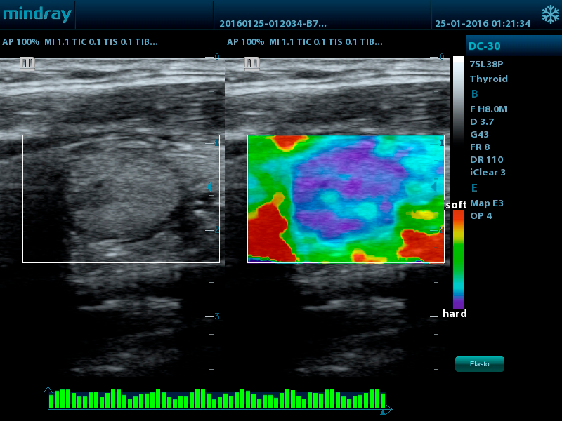 • Natural Touch Elastography - опция оценки эластичности ткани (эластография). Компрессионный метод. Действует на линейном датчике 75L38Р